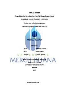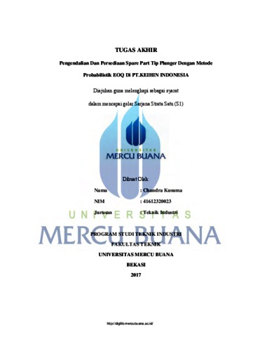 KUSUMA, CHANDRA (2017) PENGENDALIAN DAN PERSEDIAAN SPARE PART TIP PLUNGER DENGAN METODE PROBABILISTIK EOQ DI PT.KEIHIN INDONESIA. S1 thesis, UNIVERSITAS MERCU BUANA - BUNCIT.