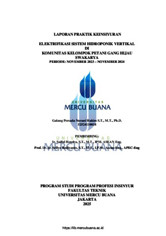 HAKIM, GALANG PERSADA NURANI (2025) ELEKTRIFIKASI SISTEM HIDROPONIK VERTIKAL DI KOMUNITAS KELOMPOK PETANI GANG HIJAU SWAKARYA PERIODE: NOVEMBER 2023 - NOVEMBER 2024. S1 thesis, Universitas Mercu Buana Jakarta.
