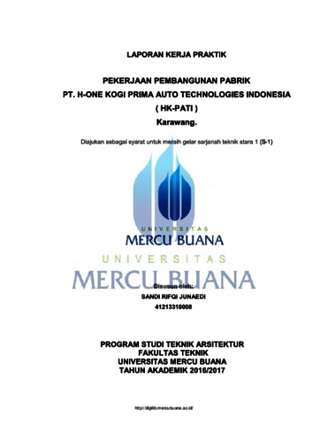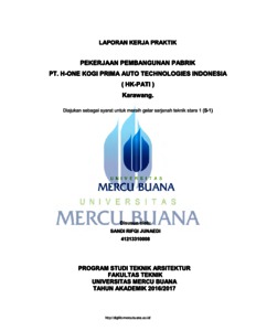 JUNAEDI, SANDI RIFQI (2016) PEKERJAAN PEMBANGUNAN PABRIK PT. H-ONE KOGI PRIMA AUTO TECHNOLOGIES INDONESIA (HK-PATI) KARAWANG. S1 thesis, UNIVERISTAS MERCU BUANA - BUNCIT.