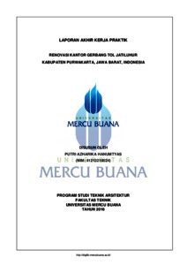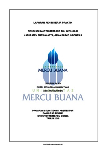 HANUMTYAS, PUTRI AZHARIKA (2016) RENOVASI KANTOR GERBANG TOL JATILUHUR KABUPATEN PURWAKARTA, JAWA BARAT, INDONESIA. S1 thesis, UNIVERISTAS MERCU BUANA - BUNCIT.