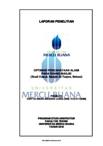 LUBIS, CINTYA INDAH MEIDINA (2019) OPTIMASI PENCAHAYAAN ALAMI PADA RUANG MASJID (STUDI KASUS: MASJID AT-TAQWA, BEKASI). S1 thesis, UNIVERISTAS MERCU BUANA - BUNCIT.