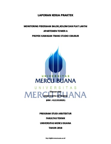SETYAWAN, GIGIH WAHYU (2018) MONITORING PEKERJAAN BALOK,KOLOM DAN PLAT LANTAI APARTEMEN TOWER A PROYEK KAWASAN TRANS STUDIO CIBUBUR. S1 thesis, UNIVERISTAS MERCU BUANA - BUNCIT.