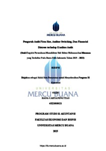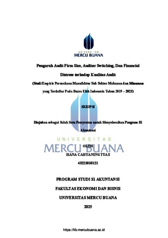 CAHYANINGTYAS, HANA (2025) PENGARUH AUDIT FIRM SIZE, AUDITOR SWITCHING, DAN FINANCIAL DISTRESS TERHADAP KUALITAS AUDIT (Studi Empiris Perusahaan Manufaktur Sub Sektor Makanan dan Minuman yang Terdaftar Pada Bursa Efek Indonesia Tahun 2019 - 2023). S1 thesis, Universitas Mercu Buana Jakarta.