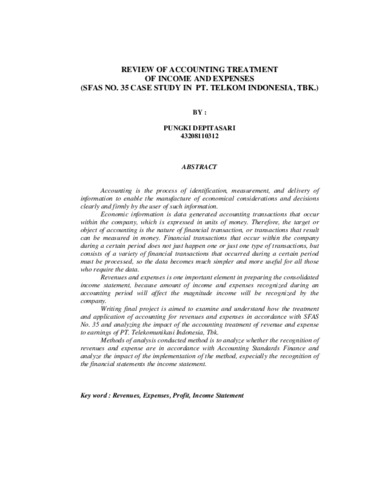 Accounting is the process of identification, measurement, and delivery of information to enable the manufacture of economical considerations and decisions clearly and firmly by the user of such information. Economic information is data generated accounting transactions that occur within the company, which is expressed in units of money. Therefore, the target or object of accounting is the nature of financial transaction, or transactions that result can be measured in money. Financial transactions that occur within the company during a certain period does not just happen one or just one type of transactions, but consists of a variety of financial transactions that occurred during a certain period must be processed, so the data becomes much simpler and more useful for all those who require the data. Revenues and expenses is one important element in preparing the consolidated income statement, because amount of income and expenses recognized during an accounting period will affect the magnitude income will be recognized by the company. Writing final project is aimed to examine and understand how the treatment and application of accounting for revenues and expenses in accordance with SFAS No. 35 and analyzing the impact of the accounting treatment of revenue and expense to earnings of PT. Telekomunikasi Indonesia, Tbk. Methods of analysis conducted method is to analyze whether the recognition of revenues and expense are in accordance with Accounting Standards Finance and analyze the impact of the implementation of the method, especially the recognition of the financial statements the income statement.