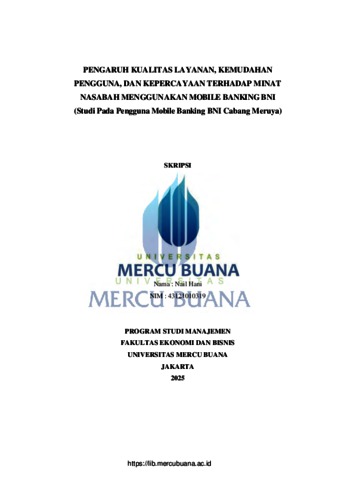 HANI, NAIL (2025) PENGARUH KUALITAS LAYANAN, KEMUDAHAN PENGGUNA, DAN KEPERCAYAAN TERHADAP MINAT NASABAH MENGGUNAKAN MOBILE BANKING BNI (Studi Pada Pengguna Mobile Banking BNI Cabang Meruya). S1 thesis, Universitas Mercu Buana Jakarta.