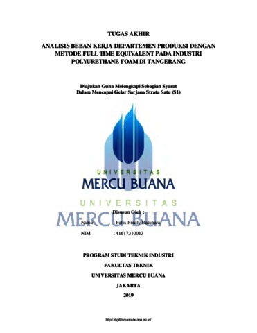 BATUBARA, FELIX FREDLY (2019) ANALISIS BEBAN KERJA DEPARTEMEN PRODUKSI DENGAN METODE FULL TIME EQUIVALENT PADA INDUSTRI POLYURETHANE FOAM DI TANGERANG. S1 thesis, UNIVERISTAS MERCU BUANA - BUNCIT.