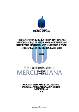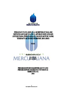 SIANIPAR, HAMONANGAN (2016) PERANAN TATA KELOLA KORPORAT DALAM MENCEGAH SAJI ULANG LAPORAN KEUANGAN (STUDI PADA PERUSAHAAN MANUFAKTUR YANG TERDAFTAR DI BEI PERIODE 2011-2015). S2 thesis, UNIVERISTAS MERCU BUANA - BUNCIT.