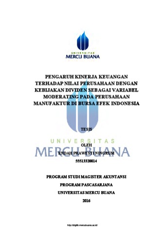 NINGRUM, ENDAH PRAWESTI (2016) PENGARUH KINERJA KEUANGAN TERHADAP NILAI PERUSAHAAN DENGAN KEBIJAKAN DIVIDEN SEBAGAI VARIABEL MODERATING PADA PERUSAHAAN MANUFAKTUR DI BURSA EFEK INDONESIA. S2 thesis, UNIVERSITAS MERCU BUANA - BUNCIT.
