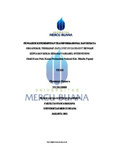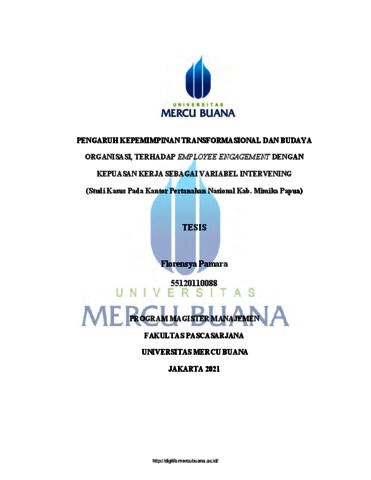 PAMARA, FLORENSYA (2022) PENGARUH KEPEMIMPINAN TRANSFORMASIONAL DAN BUDAYA ORGANISASI, TERHADAP EMPLOYEE ENGAGEMENT DENGAN KEPUASAN KERJA SEBAGAI VARIABEL INTERVENING (STUDI KASUS PADA KANTOR PERTANAHAN NASIONAL KAB. MIMIKA PAPUA). S2 thesis, UNIVERISTAS MERCU BUANA - BUNCIT.