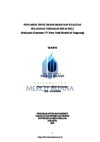 SYAIRAMESTA, GANTARA SHAKTI (2025) PENGARUH TRUST, BRAND IMAGE DAN KUALITAS PELAYANAN TERHADAP MINAT BELI (Studi pada Konsumen CV. Putra Tasik Mandiri di Tangerang). S1 thesis, Universitas Mercu Buana Jakarta.