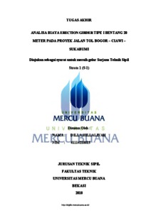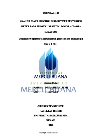 HILLALIYAH, DILLA (2018) ANALISA BIAYA ERECTION GIRDER TIPE I BENTANG 20 METER PADA PROYEK JALAN TOL BOGOR – CIAWI – SUKABUMI. S1 thesis, UNIVERISTAS MERCU BUANA - BUNCIT.