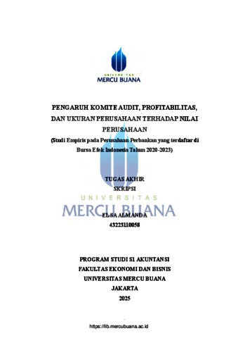 ALMANDA, ELSA (2025) PENGARUH KOMITE AUDIT, PROFITABILITAS, DAN UKURAN PERUSAHAAN TERHADAP NILAI PERUSAHAAN (Studi Empiris pada Perusahaan Perbankan yang terdaftar di Bursa Efek Indonesia Tahun 2020-2023). S1 thesis, Universitas Mercu Buana Jakarta.
