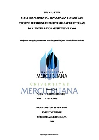 ARBIANTO, BRIAN (2018) STUDI EKSPERIMENTAL PENGGUNAAN FLY ASH DAN STYRENE BUTADIENE RUBBER TERHADAP KUAT TEKAN DAN LENTUR BETON MUTU TINGGI K-600. S1 thesis, UNIVERSITAS MERCU BUANA - BUNCIT.