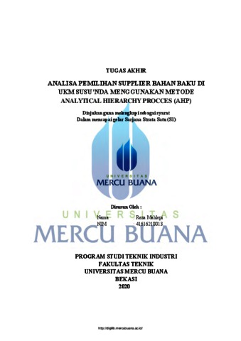MAHLEPI, REZA (2020) ANALISA PEMILIHAN SUPPLIER BAHAN BAKU DI UKM SUSU’NDA MENGGUNAKAN METODE ANALYTICAL HIERARCHY PROCCES (AHP). S1 thesis, UNIVERSITAS MERCU BUANA - BUNCIT.