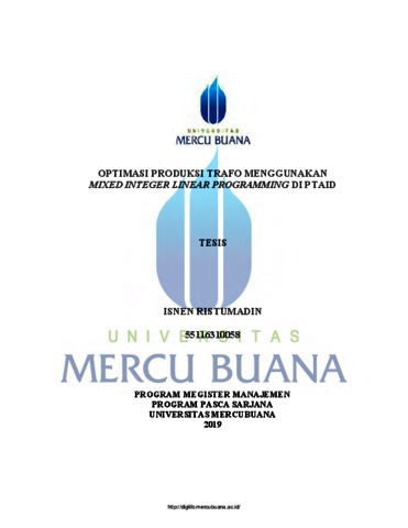 RISTUMADIN, ISNEN (2019) OPTIMASI PRODUKSI TRAFO MENGGUNAKAN MIXED INTEGER LINEAR PROGRAMMING DI PTAID. S2 thesis, UNIVERSITAS MERCU BUANA - BUNCIT.