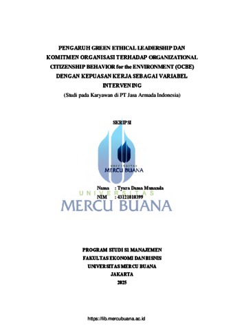 MUNANDA, TYARA DAMA (2025) PENGARUH GREEN ETHICAL LEADERSHIP DAN KOMITMEN ORGANISASI TERHADAP ORGANIZATIONAL CITIZENSHIP BEHAVIOR for the ENVIRONMENT (OCBE) DENGAN KEPUASAN KERJA SEBAGAI VARIABEL. S1 thesis, Universitas Mercu Buana Jakarta.