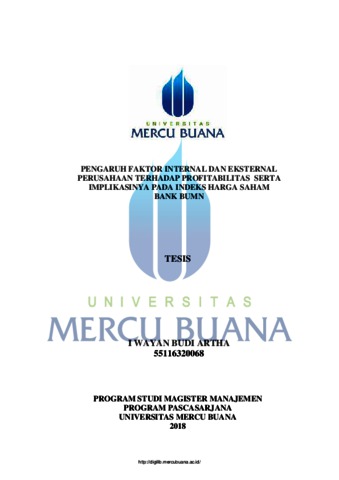 BUDI ARTHA, I WAYAN (2018) PENGARUH FAKTOR INTERNAL DAN EKSTERNAL PERUSAHAAN TERHADAP PROFITABILITAS SERTA IMPLIKASINYA PADA INDEKS HARGA SAHAM BANK BUMN. S2 thesis, UNIVERSITAS MERCU BUANA - BUNCIT.