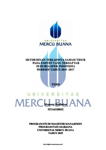 SIMBOLON, MONANG (2019) DETERMINAN TERJADINYA SAHAM TIDUR PADA EMITE NYANG TERDAFTAR DI BURSA EFEK INDONESIA PERIODE TAHUN 2015-2017. S2 thesis, UNIVERSITAS MERCU BUANA - BUNCIT.
