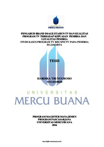 NUGROHO, HARDIKA TRI (2016) PENGARUH BRAND IMAGE STASIUN TV DAN KUALITAS PROGRAM TV TERHADAP KEPUASAN PEMIRSA DAN LOYALITAS PEMIRSA STUDI KASUS PROGRAM TV KDI MNCTV PADA PEMIRSA DI JAKARTA. S2 thesis, UNIVERISTAS MERCU BUANA - BUNCIT.