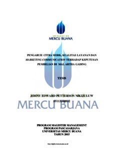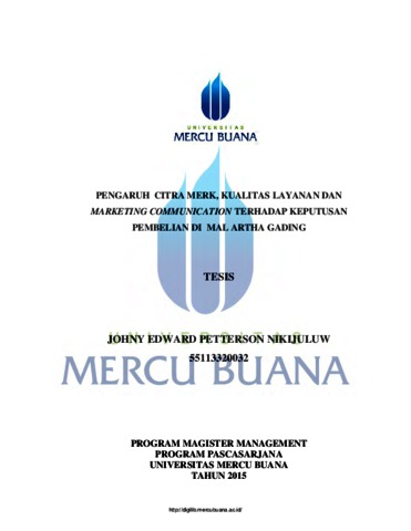 PETTERSON NIKIJULUW, JOHNY EDWARD (2016) PENGARUH CITRA MERK, KUALITAS LAYANAN DAN MARKETING COMMUNICATION TERHADAP KEPUTUSAN PEMBELIAN DI MAL ARTHA GADING. S2 thesis, UNIVERISTAS MERCU BUANA - BUNCIT.