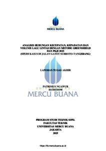 NGAWUR, PATRISIUS (2025) ANALISIS HUBUNGAN KECEPATAN, KEPADATAN DAN VOLUME LALU LINTAS DENGAN METODE GREENSHIELD DAN PKJI 2023 (STUDI KASUS DI JALAN GATOT SUBROTO-TANGERANG). S1 thesis, Universitas Mercu Buana Jakarta.