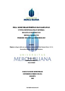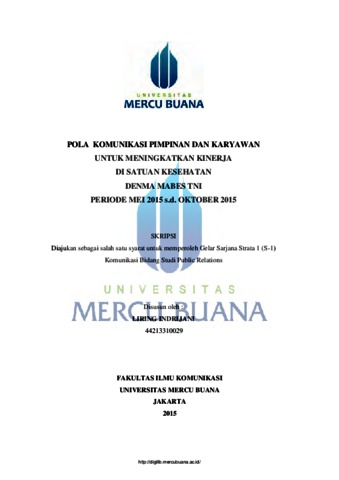 INDRIJANI, LIRING (2015) POLA KOMUNIKASI PIMPINAN DAN KARYAWAN UNTUK MENINGKATKAN KINERJA DI SATUAN KESEHATAN DENMAMABES TNI PERIODE MEI 2015 s.d. OKTOBER 2015. S1 thesis, Universitas Mercu Buana Bekasi.