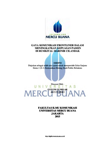 GUMILAR, GUGUM (2015) GAYA KOMUNIKASI FRONTLINERDALAM MENINGKATKAN KEPUASAN PASIEN DI RUMKITAL MARINIR CILANDAK. S1 thesis, Universitas Mercu Buana Bekasi.