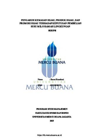 HAMDANI, IHSAN (2025) PENGARUH KEMASAN HIJAU, PRODUK HIJAU, DAN PROMOSI HIJAU TERHADAP KEPUTUSAN PEMBELIAN SUSU MILO RAMAH LINGKUNGAN. S1 thesis, Universitas Mercu Buana Jakarta.