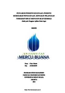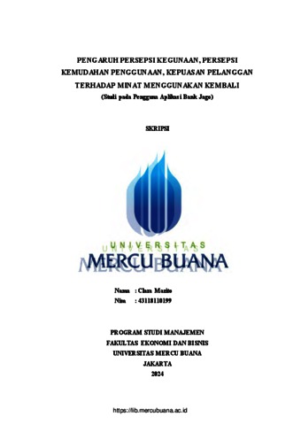 MARITO, CLARA (2024) PENGARUH PERSEPSI KEGUNAAN, PERSEPSI KEMUDAHAN PENGGUNAAN, KEPUASAN PELANGGAN TERHADAP MINAT MENGGUNAKAN KEMBALI (Studi pada Pengguna Aplikasi Bank Jago). S1 thesis, Universitas Mercu Buana Jakarta.