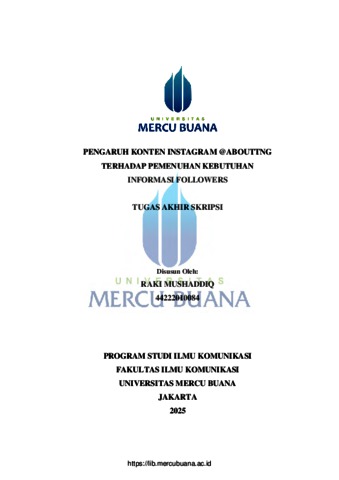 MUSHADDIQ, RAKI (2025) PENGARUH KONTEN INSTAGRAM @ABOUTTNG TERHADAP PEMENUHAN KEBUTUHAN INFORMASI FOLLOWERS. S1 thesis, Universitas Mercu Buana Jakarta.