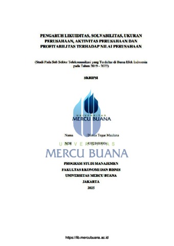 MAULANA, DIMAS TEGAR (2025) PENGARUH LIKUIDITAS, SOLVABILITAS, UKURAN PERUSAHAAN, AKTIVITAS PERUSAHAAN DAN PROFITABILITAS TERHADAP NILAI PERUSAHAAN (Studi Pada Sub Sektor Telekomunikasi yang Terdaftar di Bursa Efek Indonesia pada Tahun 2019 - 2023). S1 thesis, Universitas Mercu Buana Jakarta.