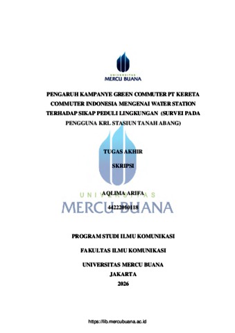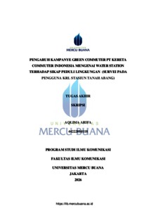 ARIFA, AQLIMA (2026) PENGARUH KAMPANYE GREEN COMMUTER PT KERETA COMMUTER INDONESIA MENGENAI WATER STATION TERHADAP SIKAP PEDULI LINGKUNGAN (SURVEI PADA PENGGUNA KRL STASIUN TANAH ABANG). S1 thesis, Universitas Mercu Buana Jakarta.