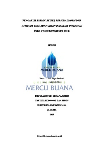 PAMBUDI, CIKAL BAGUS (2025) PENGARUH KARMIC BELIEF, PERSONAL NORM DAN ATTITUDE TERHADAP GREEN PURCHASE INTENTION PADA KONSUMEN GENERASI Z. S1 thesis, Universitas Mercu Buana Jakarta.