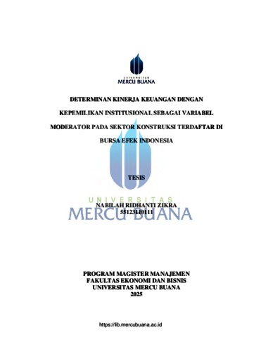 ZIKRA, NABILAH RIDHANTI (2025) DETERMINAN KINERJA KEUANGAN DENGAN KEPEMILIKAN INSTITUSIONAL SEBAGAI VARIABEL MODERATOR PADA SEKTOR KONSTRUKSI TERDAFTAR DI BURSA EFEK INDONESIA. S2 thesis, Universitas Mercu Buana Jakarta.