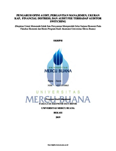 JASON, JASON (2019) PENGARUH OPINI AUDIT, PERGANTIAN MANAJEMEN, UKURAN KAP, FINANCIAL DISTRESS, DAN AUDIT FEE TERHADAP AUDITOR SWITCHING. S1 thesis, UNIVERSITAS MERCU BUANA - BUNCIT.