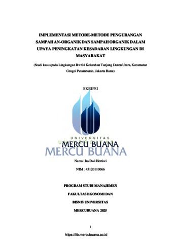 HERTIWI, IRA DWI (2025) IMPLEMENTASI METODE-METODE PENGURANGAN SAMPAH AN-ORGANIK DAN SAMPAH ORGANIK DALAM UPAYA PENINGKATAN KESADARAN LINGKUNGAN DI MASYARAKAT (Studi kasus pada Lingkungan Rw 04 Kelurahan Tanjung Duren Utara, Kecamatan Grogol Petamburan, Jakarta Barat). S1 thesis, Universitas Mercu Buana Jakarta.