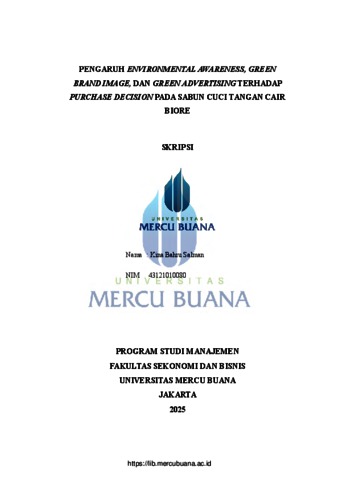 SALMAN, KINA BAHRU (2025) PENGARUH ENVIRONMENTAL AWARENESS, GREEN BRAND IMAGE, DAN GREEN ADVERTISING TERHADAP PURCHASE DECISION PADA SABUN CUCI TANGAN CAIR BIORE. S1 thesis, Universitas Mercu Buana Jakarta.