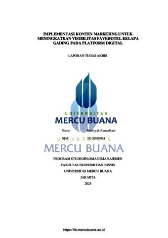 RAMADHANI, HANIYYAH (2025) IMPLEMENTASI KONTEN MARKETING UNTUK MENINGKATKAN VISIBILITAS FAVEHOTEL KELAPA GADING PADA PLATFORM DIGITAL. D3 thesis, Universitas Mercu Buana Jakarta.