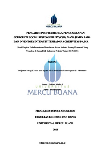 FAKHRY, FAISHAL MEDIA (2024) PENGARUH PROFITABILITAS, PENGUNGKAPAN CORPORATE SOCIAL RESPONSIBILITY (CSR), MANAJEMEN LABA DAN INVENTORY INTENSITY TERHADAP AGRESIVITAS PAJAK (Studi Empiris Pada Perusahaan Manufaktur Sektor Industri Barang Konsumsi Yang Terdaftar di Bursa Efek Indonesia Periode Tahun 2017-2021). S1 thesis, Universitas Mercu Buana Jakarta.