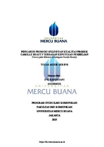 HANDAYANI, EVI (2026) PENGARUH PROMOSI ONLINE DAN KUALITAS PRODUK CAMILLE BEAUTY TERHADAP KEPUTUSAN PEMBELIAN (Survey pada followers di Instagram Camille Beauty). S1 thesis, Universitas Mercu Buana Jakarta.