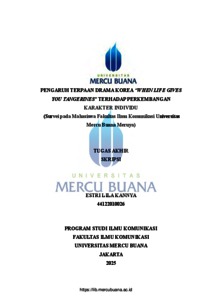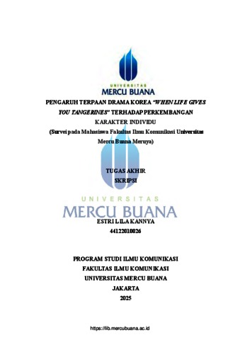 KANNYA, ESTRI LILA (2025) PENGARUH TERPAAN DRAMA KOREA "WHEN LIFE GIVES YOU TANGERINE" TERHADAP PERKEMBANGAN KARAKTER INDIVIDU (Survei pada Mahasiswa Fakultas Ilmu Komunikasi Universitas Mercu Buana Meruya). S1 thesis, Universitas Mercu Buana Jakarta.
