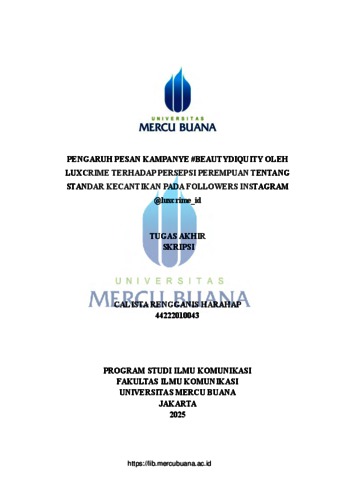 HARAHAP, CALISTA RENGGANIS (2026) PENGARUH PESAN KAMPANYE #BEAUTYDIQUITY OLEH LUXCRIME TERHADAP PERSEPSI PEREMPUAN TENTANG STANDAR KECANTIKAN PADA FOLLOWERS INSTAGRAM @luxcrime_id. S1 thesis, Universitas Mercu Buana Jakarta.