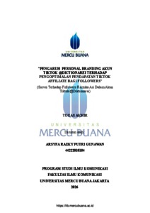 GUNAWAN, ARSYFA RAZKY PUTRI GUNAWANARSYFA RAZKY PUTRI (2026) PENGARUH PERSONAL BRANDING AKUN TIKTOK @DICTIONAREI TERHADAP PENGOPTIMALAN PENDAPATAN TIKTOK AFFILIATE BAGI FOLLOWERS (Survei Terhadap Followers Reizuka Ari Dalam Akun Tiktok @Diktionarei). S1 thesis, Universitas Mercu Buana Jakarta.