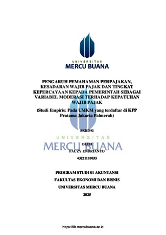 ENDRIANTO, FAUZY (2025) PENGARUH PEMAHAMAN PERPAJAKAN, KESADARAN WAJIB PAJAK DAN TINGKAT KEPERCAYAAN KEPADA PEMERINTAH SEBAGAI VARIABEL MODERASI TERHADAP KEPATUHAN WAJIB PAJAK (Studi Empiris: Pada UMKM yang terdaftar di KPP Pratama Jakarta Palmerah). S1 thesis, Universitas Mercu Buana Jakarta.
