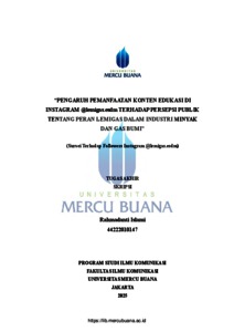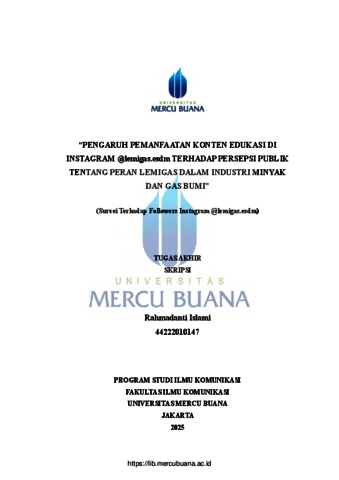 ISLAMI, RAHMADANTI (2026) "PENGARUH PEMANFAATAN KONTEN EDUKASI DI INSTAGRAM @lemigas.esdm TERHADAP PERSEPSI PUBLIK TENTANG PERAN LEMIGAS DALAM INDUSTRI MINYAK DAN GAS BUMI" (Survei Terhadap Followers Instagram @lemigas.esdm). S1 thesis, Universitas Mercu Buana Jakarta.