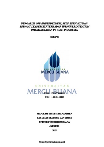YUNINGSIH, NOVI (2025) PENGARUH JOB EMBEDDEDNESS, SELF-EFFICACY DAN SERVANT LEADERSHIP TERHADAP TURNOVER INTENTION PADA KARYAWAN PT ROKI INDONESIA. S1 thesis, Universitas Mercu Buana Jakarta.