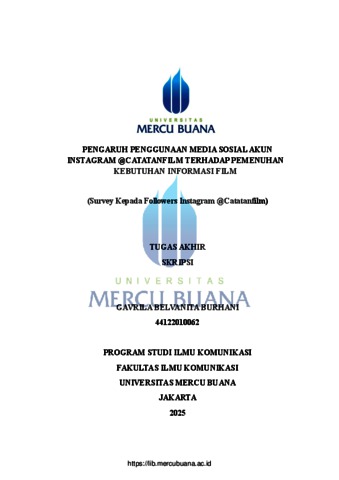 BURHANI, GAVRILA BELVANITA (2026) PENGARUH PENGGUNAAN MEDIA SOSIAL AKUN INSTAGRAM @CATATANFILM TERHADAP PEMENUHAN KEBUTUHAN INFORMASI FILM (Survey Kepada Followers Instagram @Catatanfilm). S1 thesis, Universitas Mercu Buana Jakarta.