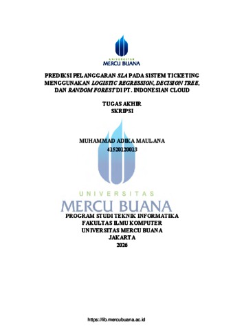 MAULANA, MUHAMMAD ADIKA (2026) PREDIKSI PELANGGARAN SLA PADA SISTEM TICKETING MENGGUNAKAN LOGISTIC REGRESSION, DECISION TREE, DAN RANDOM FOREST DI PT. INDONESIAN CLOUD. S1 thesis, Universitas Mercu Buana Jakarta.