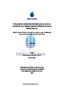 This study aims to determine the effect of Information Asymmetry, Auditor Quality, and Business Risk on Firm Value. The populations used on this research are from healthcare companies listed on the Indonesia Stock Exchange from 2019 to 2023. The sample in this study amounted 18 companies observed over 5 years, resulting in a total sample size of 90 data points. The data were analyzed using SPSS version 25, adopting multiple linear regression as the analytical technique. The results of this study indicate that Information Asymmetry does not have a significant effect on Firm Value, while Auditor Quality has a positive effect on Firm Value, and Business Risk has a negative effect on Firm Value. Keywords: Asymmetry, Auditor, Risk, Firm Value Penelitian ini bertujuan untuk mengetahui pengaruh Asimetri Informasi, Kualitas Auditor, dan Risiko Bisnis terhadap Nilai Perusahaan. Populasi penelitian yang digunakan dalam penelitian ini adalah perusahaan kesehatan yang terdaftar di Bursa Efek Indonesia tahun 2019-2023. Sampel dalam penelitian ini berjumlah 18 perusahaan dengan pengamatan 5 tahun, maka jumlah dari sampel keseluruhan adalah 90 data sampel. Metode pengambilan sampel yang digunakan adalah purposive sampling. Alat pengolah data yang digunakan adalah perangkat lunak SPSS versi 25 dan menggunakan analisis regresi linier berganda sebagai teknik analisis data. Hasil penelitian ini menunjukan bahwa Asimetri Informasi tidak berpengaruh signifikan terhadap Nilai Perusahaan, Kualitas Auditor berpengaruh positif terhadap Nilai Perusahaan, dan Risiko Bisnis berpengaruh negatif terhadap Nilai Perusahaan. Kata kunci: Asimetri, Auditor, Risiko, Nilai Perusahaan