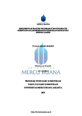 IFANDI, PRICILLIA (2025) IMPLEMENTASI PRAKTIK NEGOSIASI PT MAVEN KREATIF GEMINTANG DALAM MEMBANGUN KEMITRAAN DENGAN KEY OPINION LEADER. S1 thesis, Universitas Mercu Buana Jakarta.